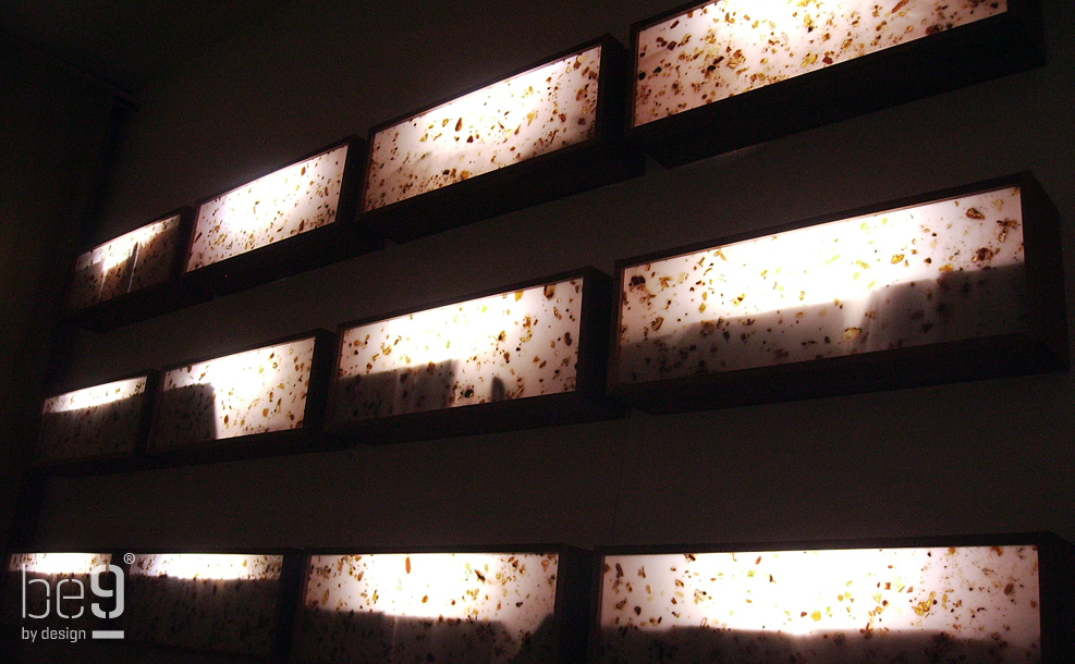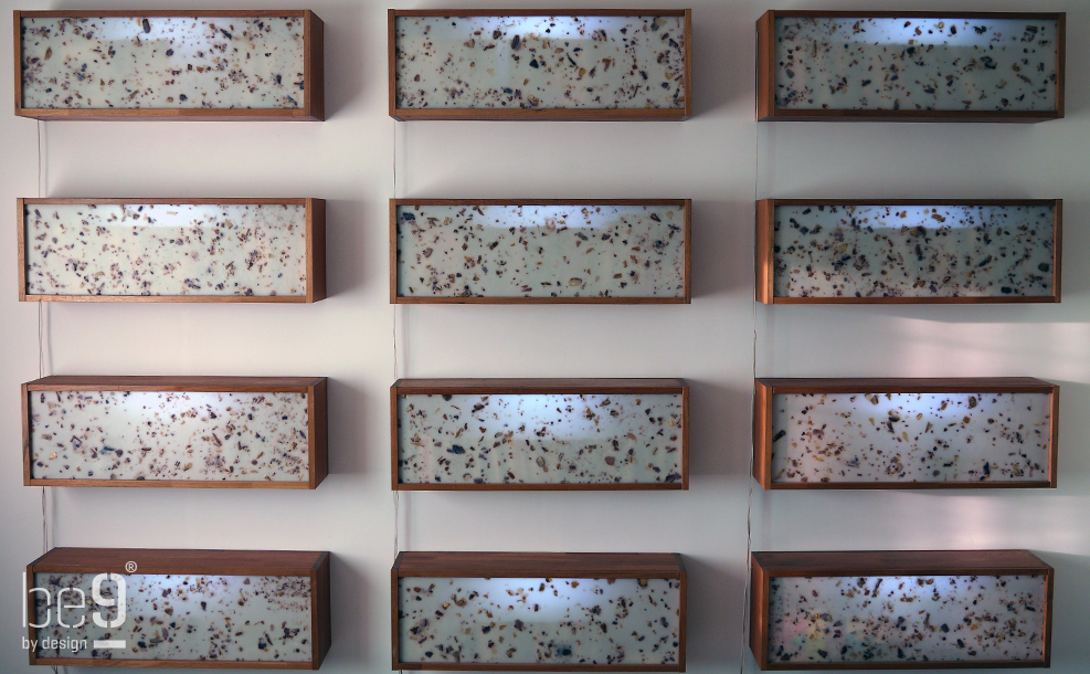 Deze 12 kasten voor dvd's en cd's zijn gemaakt uit walnoot hout. In de platen aan de voorkant zit stukjes barnsteen. Aan de binnenkant van de kastjes zit LED verlichting.